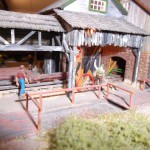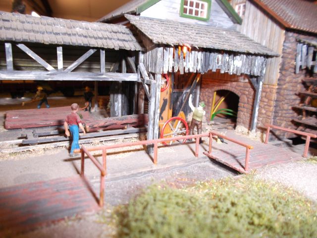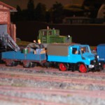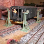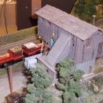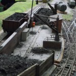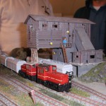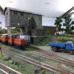 Nach der Ausstellung fing ich dann an, weitere Wagenmodelle und Gebäude zu bauen. Unter Anderem auch das Sturzgerüst. Als mir beim Transport (z B. zum Weihnachtsmarkt Hadamar 2010) mehrfach die Stützen des Sturzgerüstes abgebrochen waren, dachte ich, dass ich es auf eine Platte fest aufkleben sollte. Plattte hmmm, Diorama hmmmm, nein dann ergriff ich die Flucht nach vorne und plante eine große Anlage auf der nicht nur das Sturzgerüst Platz findet, sondern gleich der ganze Bahnhof Kerkerbach. Dieser entstand in den Jahre 2010 bis 2012 und zeigt ein Stück der Lahntalbahn ab den Ennericher Tunnel, über die Lahn, durch den Bahnhof Kerkerbach, bis zur Kurve Richtung Runkel. Daneben natürlich die umfassenden Anlagen der Schmalspurbahn teils mit dem Dreischienengleis. Die Hauptstrecke wendet dann jeweils Unterflur, im Ennericher Tunnel liegt eine Wendel mit Kehre mit ca. 10 Meter Gleislänge und 3 Blockstellen so daß die Züge nicht sofort zurückkehren. Anlagenthema ist die Zeit um 1958- 1961, als es neben den neuen KB Dieselloks noch Dampfloks und Betrieb auf der Schmalspurstrecke gab. Alle Gebäude sowie die meisten Wagen entstanden im Selbstbau/ Umbau.