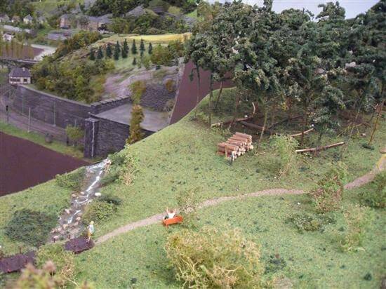 Das gilt gleichbedeutend für die H0e-Segmente, die landschaftlich ausgestaltet sind und auf denen sich ein Schotterwerk mit Gleisanschluss sowie Unterwegshaltepunkte befinden. Auch die H0e-Segmente sind variabel aufbaubar und werden im Gleichstrom-Analogbetrieb gefahren.